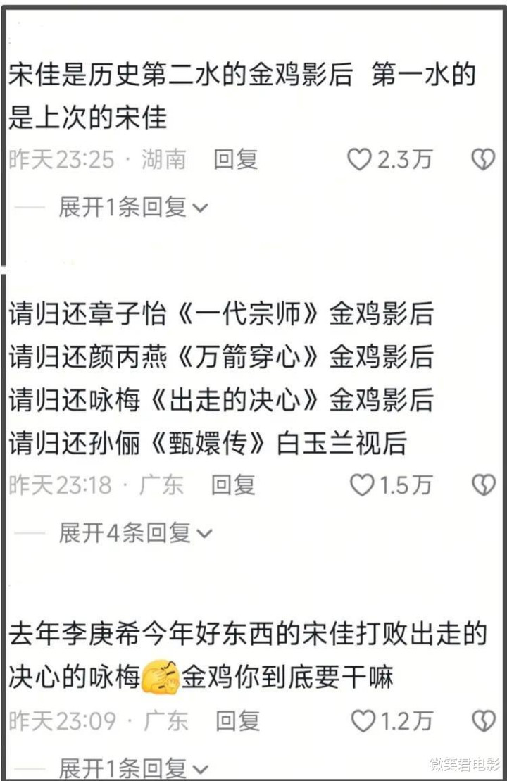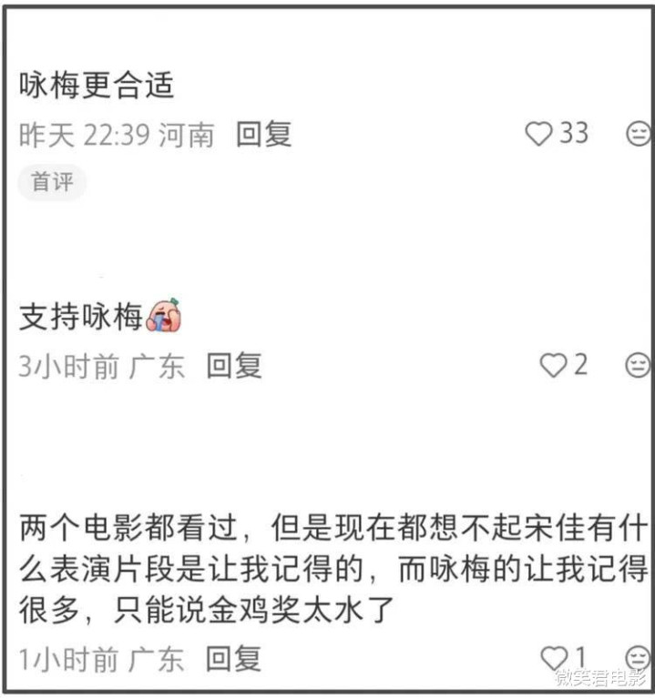 第一条高赞评论就毫不留情地写道:“金鸡奖太水了,明眼人都看得出来,同期女演员里有演技更出众、表现更惊艳的,这奖却给了宋佳,实在难以服众 。”